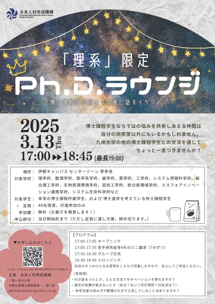 Therefore, we will be holding a face-to-face event with the aim of helping to alleviate your worries by providing a place for doctoral students to interact with each other and share common issues and worries.