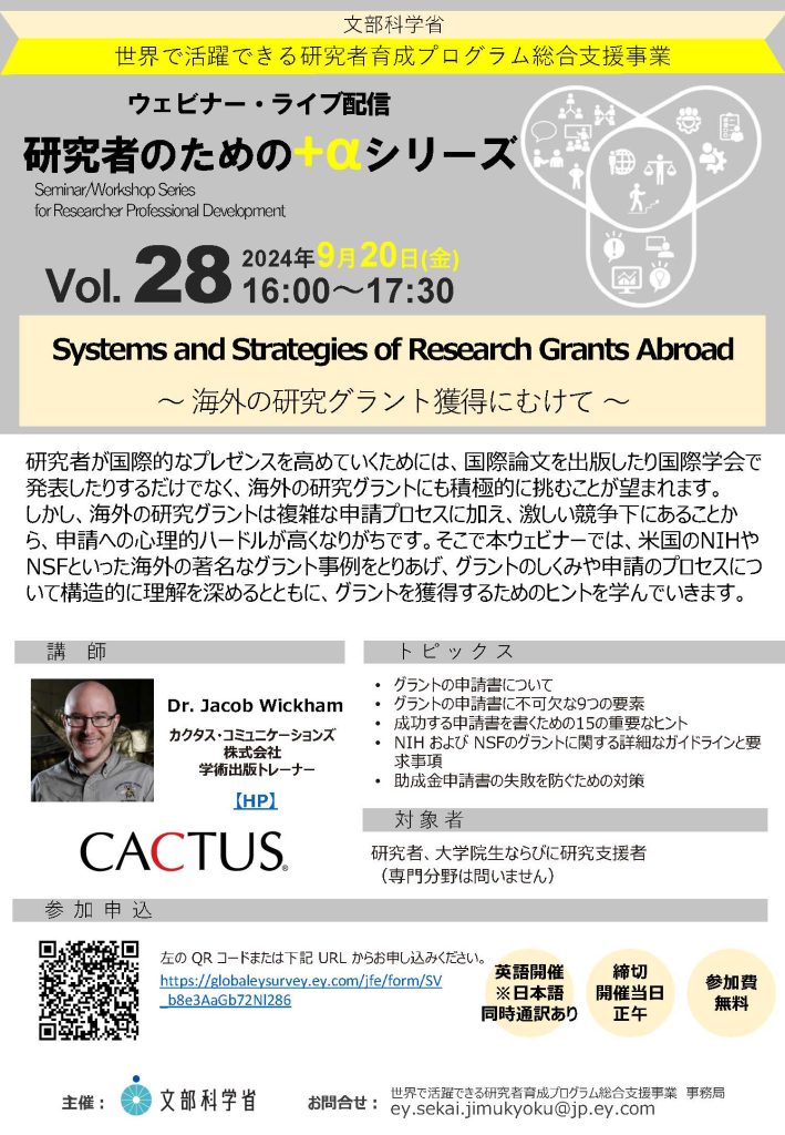 文部科学省主催のオンラインセミナー、研究者のための+αシリーズVol. 28「Systems and Strategies of Research Grants Abroad ~海外研究助成金の制度と効果的な獲得方法について~」が9月20日(金)に開催されます。